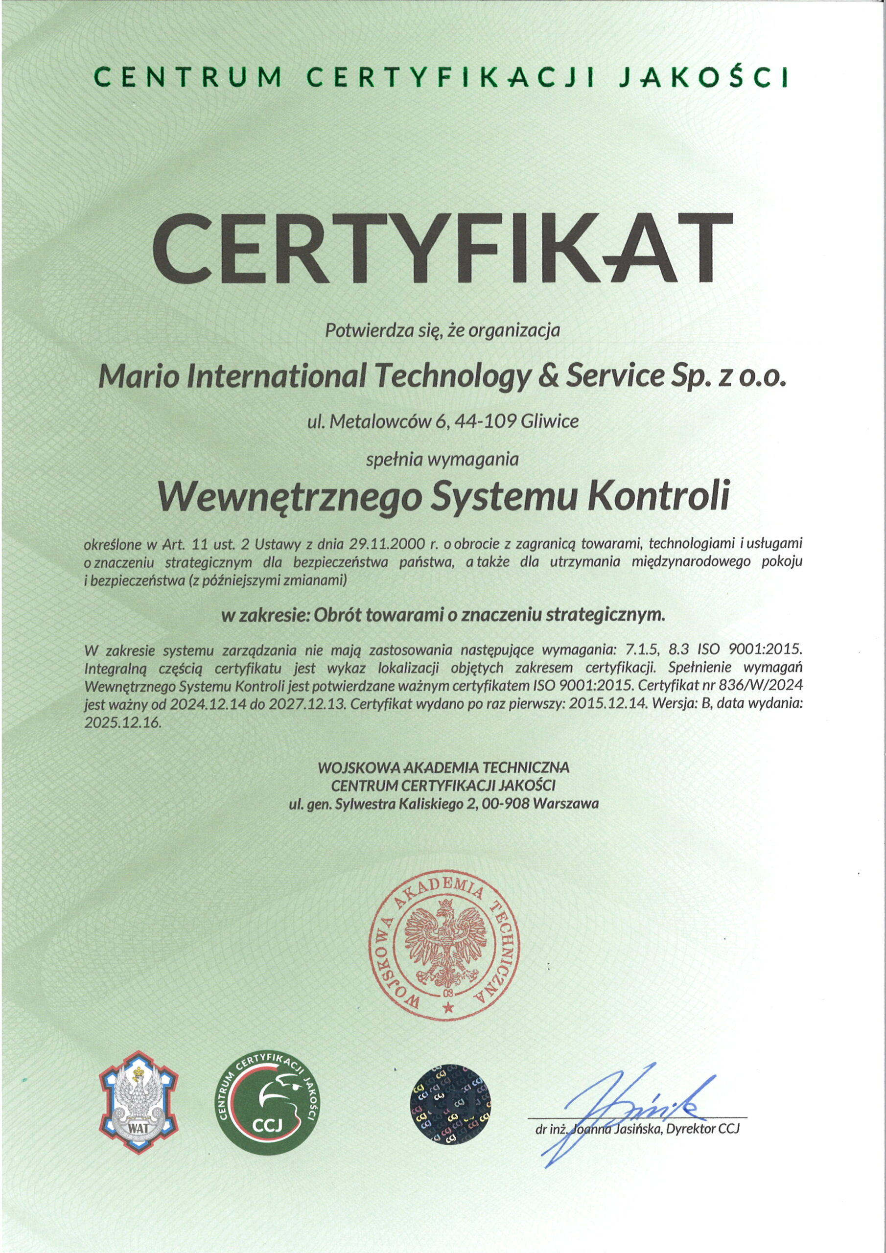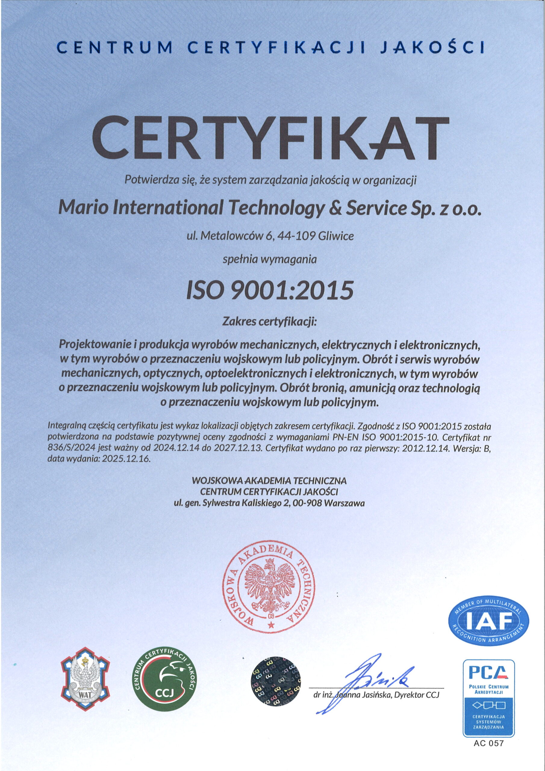 Certyfikat ISO 9001:2015 w zakresie:
