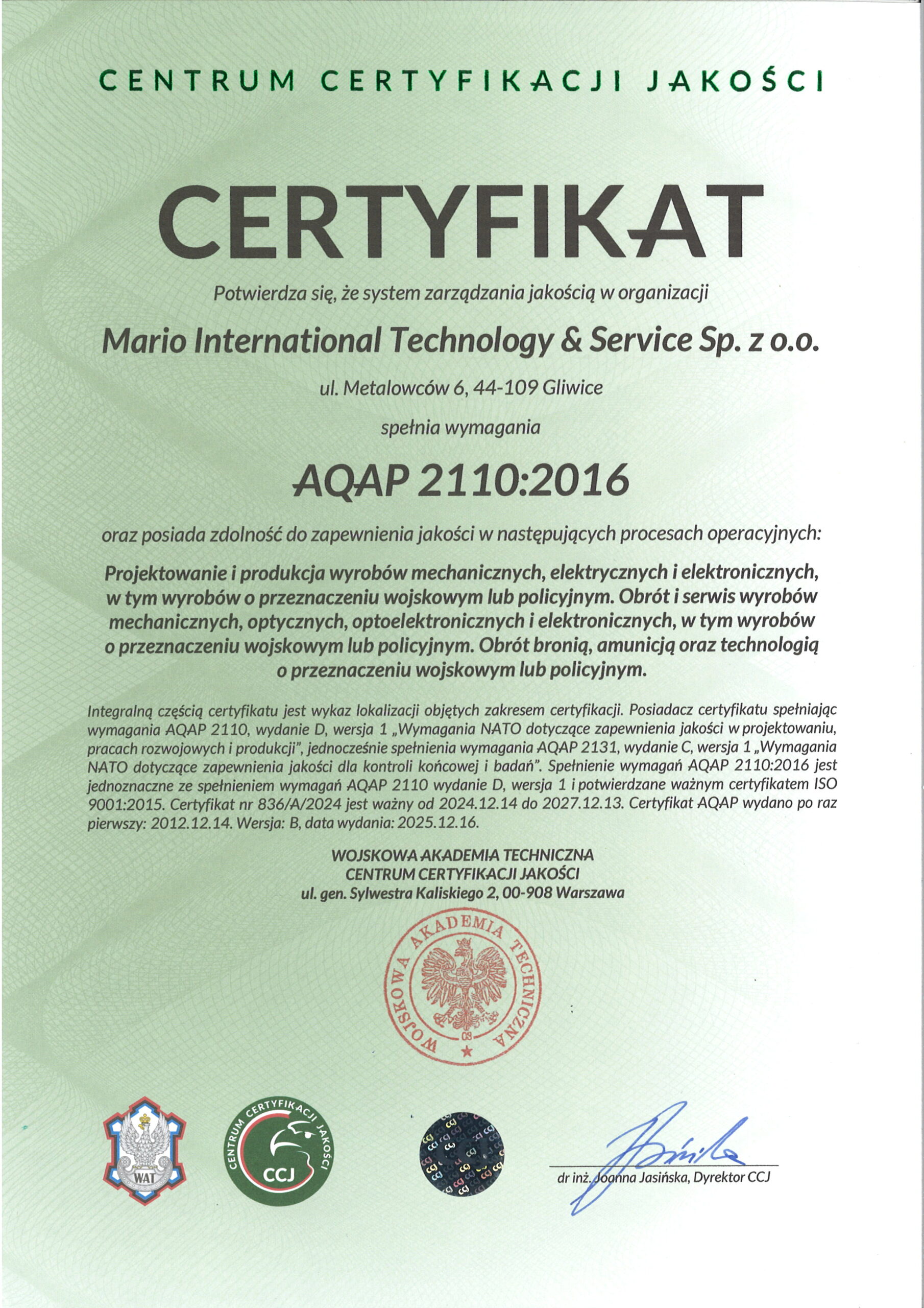 Certyfikat AQAP 2110:2016 w zakresie: